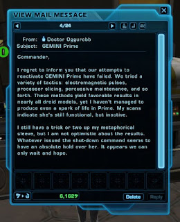 Commander,I regret to inform you that our attempts to reactivate GEMINI Prime have failed. We tried a variety of tactics: electromagnetic pulses, processor slicing, percussive maintenance, and so forth. These methods yield favorable results in nearly all droid models, yet I haven't managed to produce even a spark of life in Prime. My scans indicate she's still functional, but inactive.